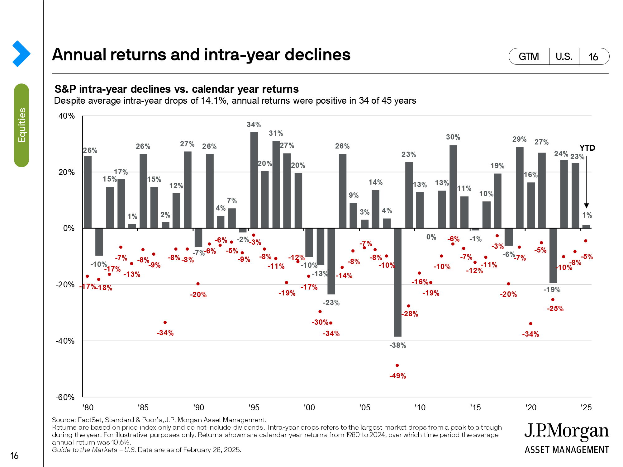 That lines up with something else that often surprises investors. The J.P. Morgan intra-year decline chart shows that, on average, markets experience a drop of about 14% during the year, even in years that end up finishing positive . In fact, the market has finished positive in the majority of years despite those intra-year pullbacks.