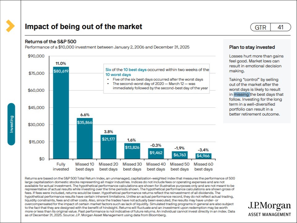 Selling after a decline doesn’t just protect you from further losses, it locks in the loss in and removes you from the recovery. And the recovery doesn’t wait. The data in your “Impact of Being Out of the Market” chart makes this incredibly clear. A $10,000 investment left fully invested grew to over $80,000, while missing just the 10 best days cut that nearly in half . Missing more of those key days reduces returns even further.